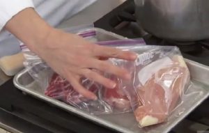 Το μόνο που χρειάζεσαι είναι πλαστικές σακούλες τροφίμων με αεροστεγές κλείσιμο και ένα κατσαρολάκι με νερό. Τοποθετείς το κατεψυγμένο κρέας στα πλαστικά σακουλάκια και το σφραγίζεις. Βάζεις το νερό να ζεσταθεί και όταν φτάσει στους 60οC βάζεις μέσα και τα σακουλάκια με το κρέας, σβήνεις το μάτι και σκεπάζεις με το καπάκι της κατσαρόλας. Σε 15 λεπτά περίπου το κρέας έχει ξεπαγώσει!