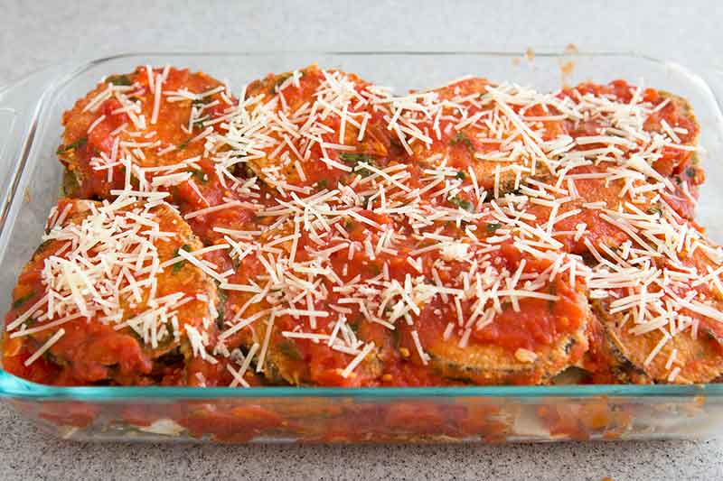 Πάνω από τις μελιτζάνες στρώνετε τις μισές φέτες παρμεζάνας και πασπαλίζετε από πάνω το 1/3 από την υπόλοιπη τριμμένη παρμεζάνα.