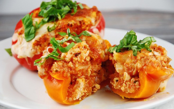 - Στη συνέχεια κόβουμε στη μέση τις πιπεριές και τις γεμίζουμε με το μείγμα του κοτόπουλου.